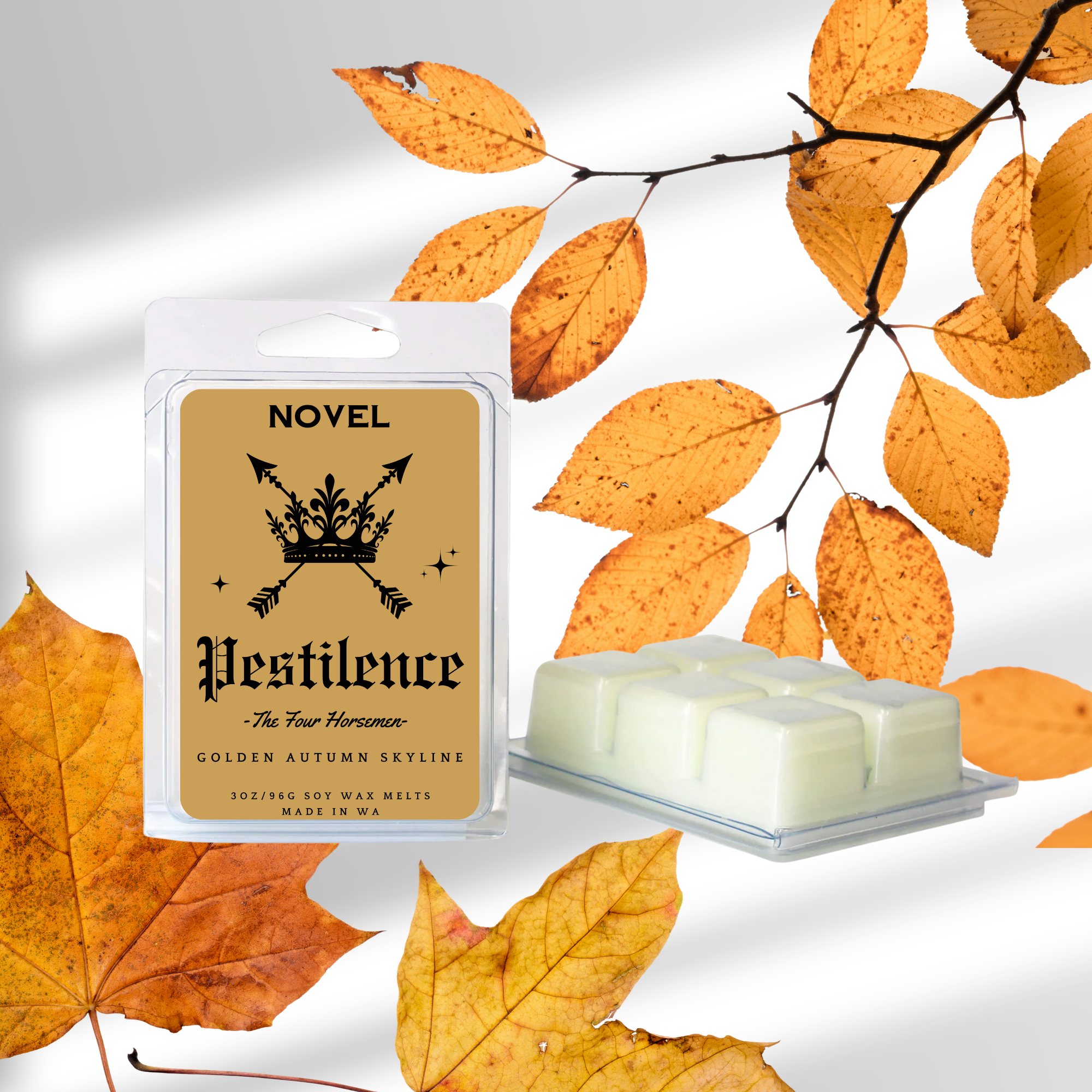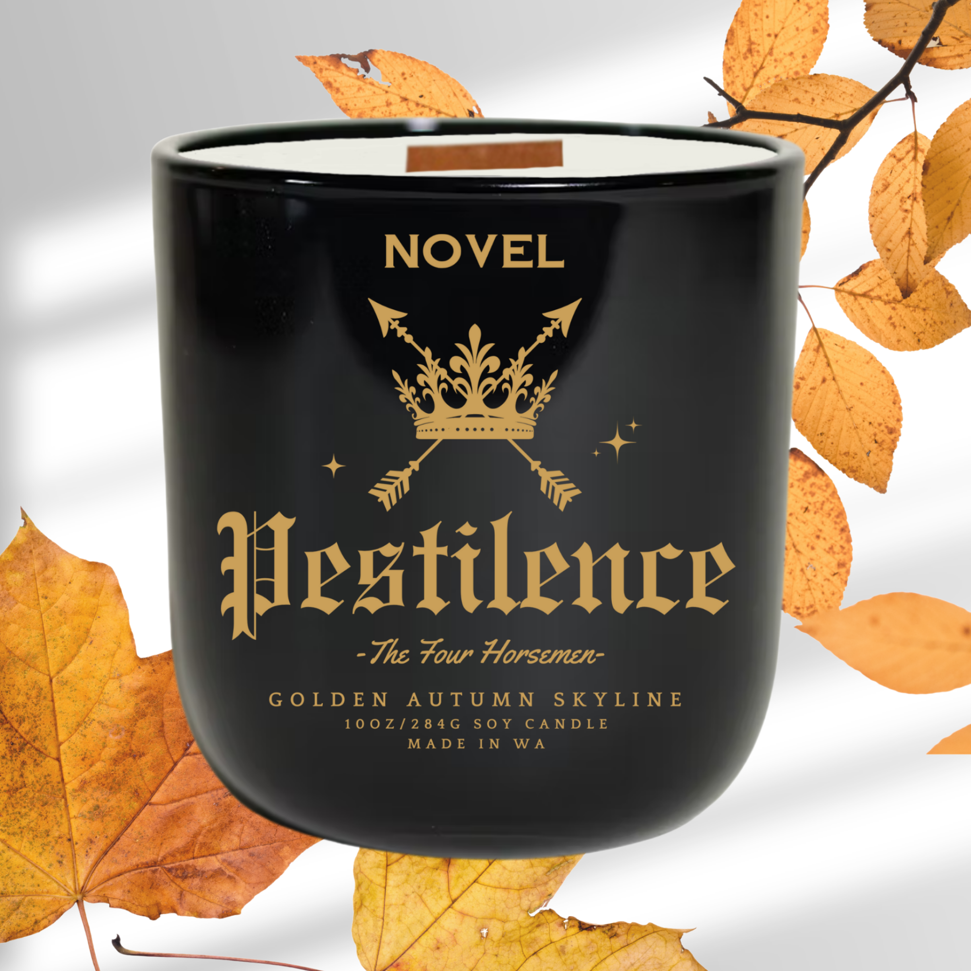 Details: Available in three size options: 3oz wax melt or 10oz candle. Each Novel Candle is made using premium soy wax, ambiance-enhancing wood wicks and uses only the highest quality and cleanest fragrance oils available. Inspired by The Four Horsemen series by Laura Thalassa. Created with permission from the author.